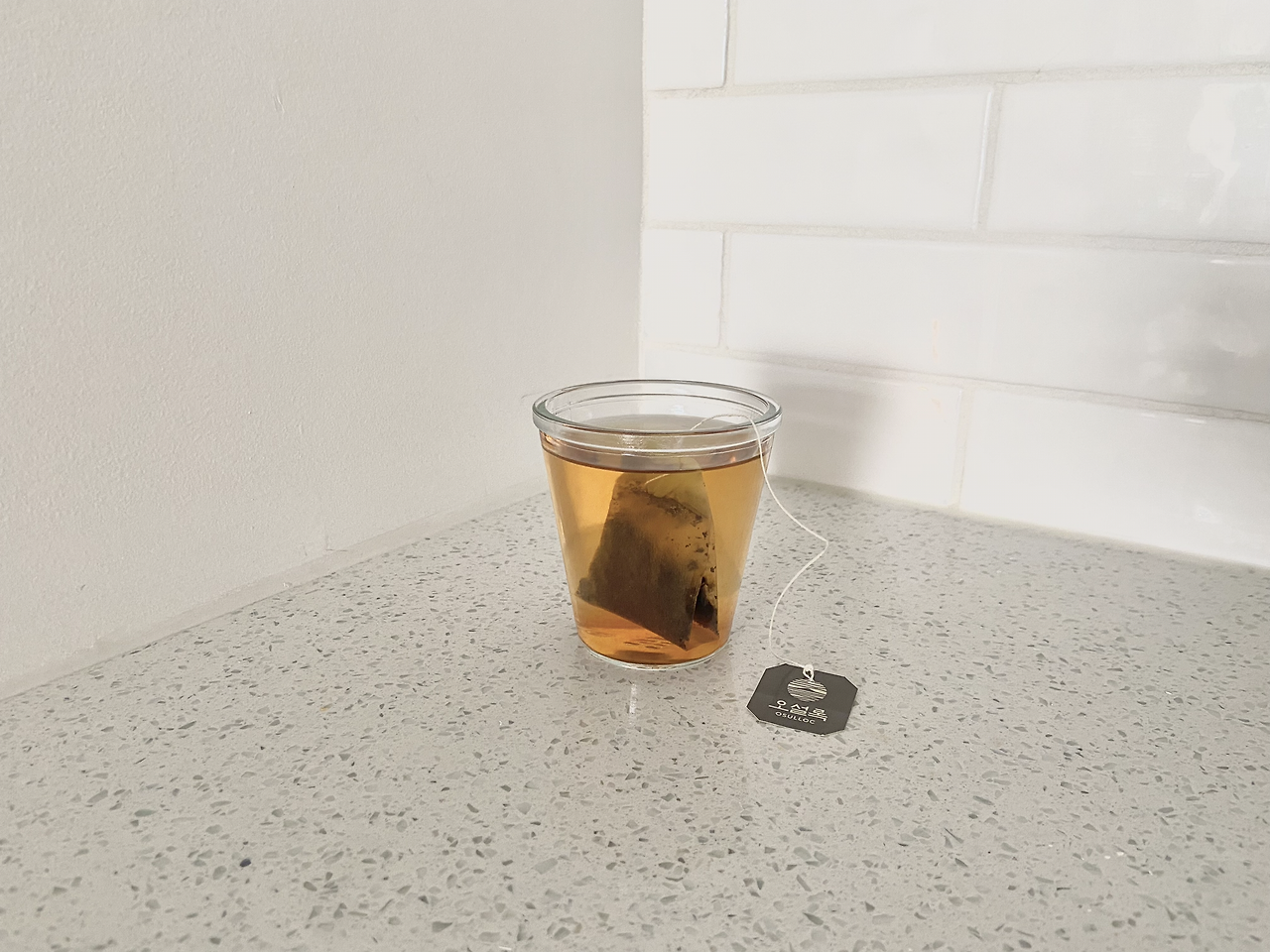 이렇게 보니 150ml는 딱 종이컵의 용량인 듯한데, 저 용량만을 마셔야 한다는 게 안타깝다. 물론 여러 번 우릴 예정이지만, 보통 세 번째 우릴 때부턴 맛이나 향이 현저하게 줄어든다. 물 온도는 보통 다른 그릇에 담을 때마다 온도가 약 10도 정도 떨어진다는 것으로 감을 잡아 포트에서 팔팔 끓인 후 보온병으로 옮겨 담았다. 그리고 컵에 물을 먼저 담아 온도를 대충 맞춘 후 티백을 넣고 2분 타이머. 도전한 티는 후발효차인 제주 삼다 영귤티.