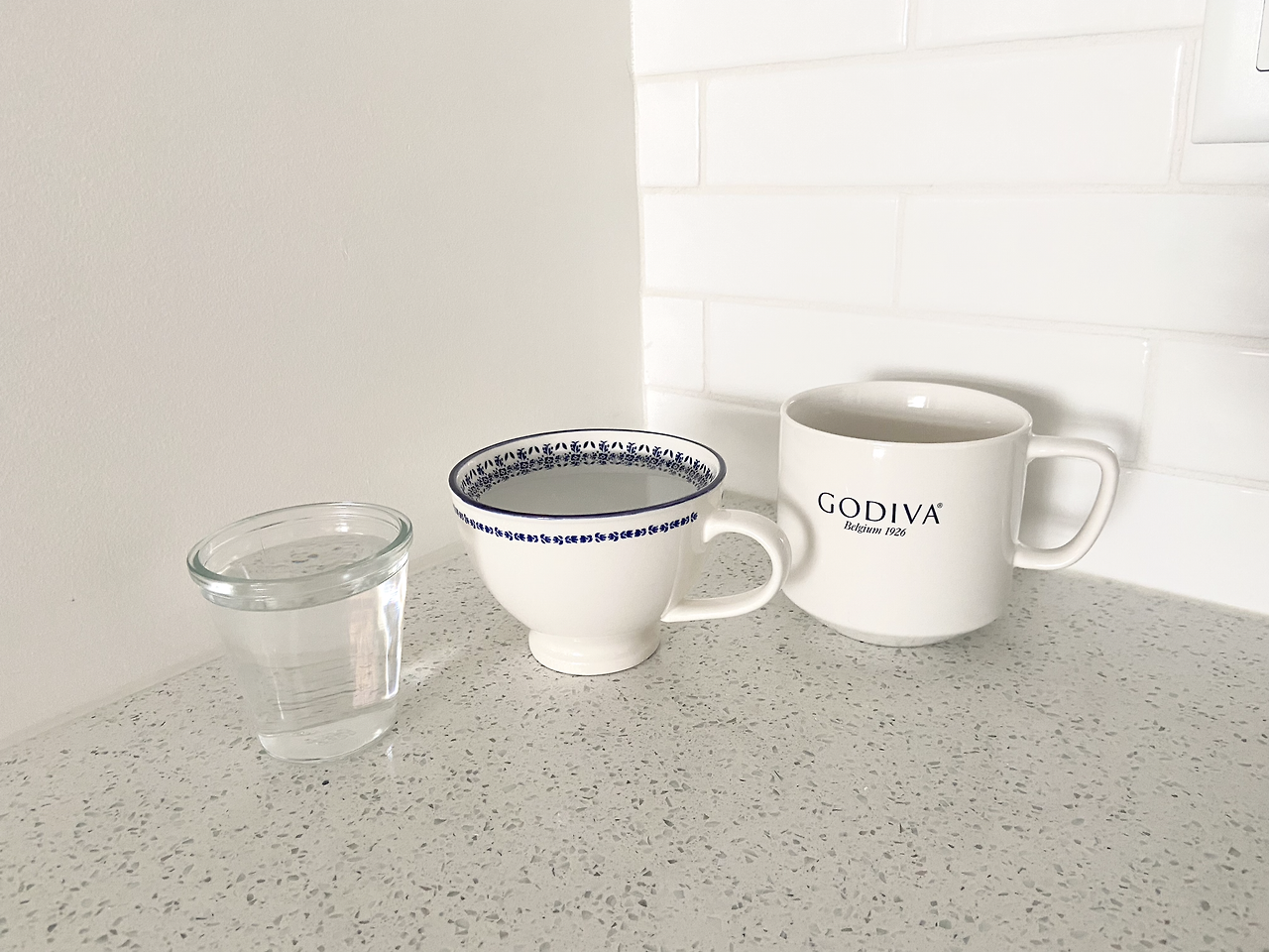 물 온도는 후발효차는 90도 녹차는 70도로, 물 용량은 150ml, 그리고 1.5~2분. 가장 충격적인 것은 물 용량이다. 150ml라니. 아니, 이것은 두세 모금이면 끝나는 양 아닌가요? 무엇보다도 머그잔은 보통 300ml부터 시작하지 않나요? 깜짝 놀라 집에 있는 머그잔들의 용량을 계량컵으로 재봤다. 대부분 300~500ml의 컵들이며 가장 작은 물컵도 250ml의 용량이었다.