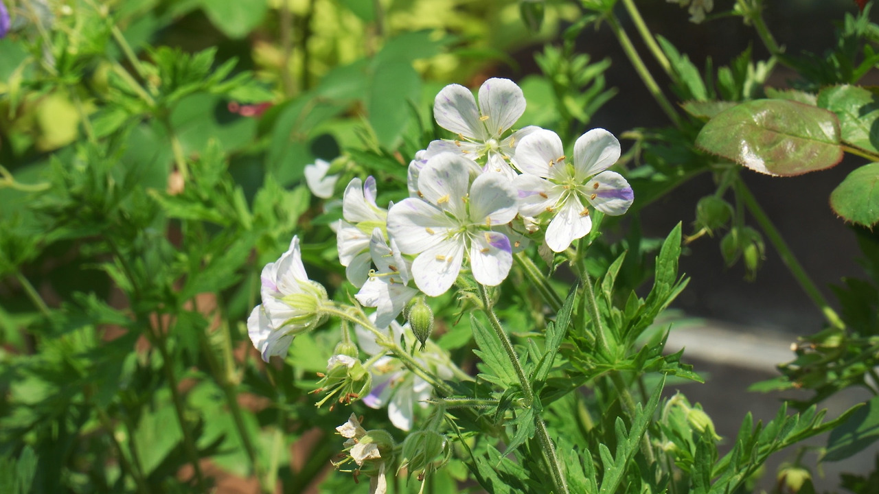 가장 놀라운 꽃은 숙근 제라늄 스플리쉬 스플래쉬다. 지난 4월 뿌리만 땅에 심었는데, 심은지 며칠 안되어 땅에서 작은 잎을 올렸다. 그 뒤로 6월까지 꽤 큼직하게 뾰족뾰족한 잎들을 잔뜩 만들고 있었다. 그러다 6월 중순의 어느 날 꽃 한 송이가 소식도 없이 개화를 시작했다. 그 한송이의 꽃은 작기도 하거니와 감상 포인트도 별로 없어 꽤 실망을 했었다. 하지만 며칠 후 꽃들이 하나둘 폭죽처럼 팡팡 터지기 시작하더니 청보라 빛 포인트 줄무늬가 오묘하게 들어간 하얀 꽃들이 가득해졌다. 이 숙근 제라늄을 바라보고 있으면 청량감 한 사발을 마신 것 같은 느낌, 6월의 덥고 습한 마당을 식혀주는 사랑스러운 꽃이다.