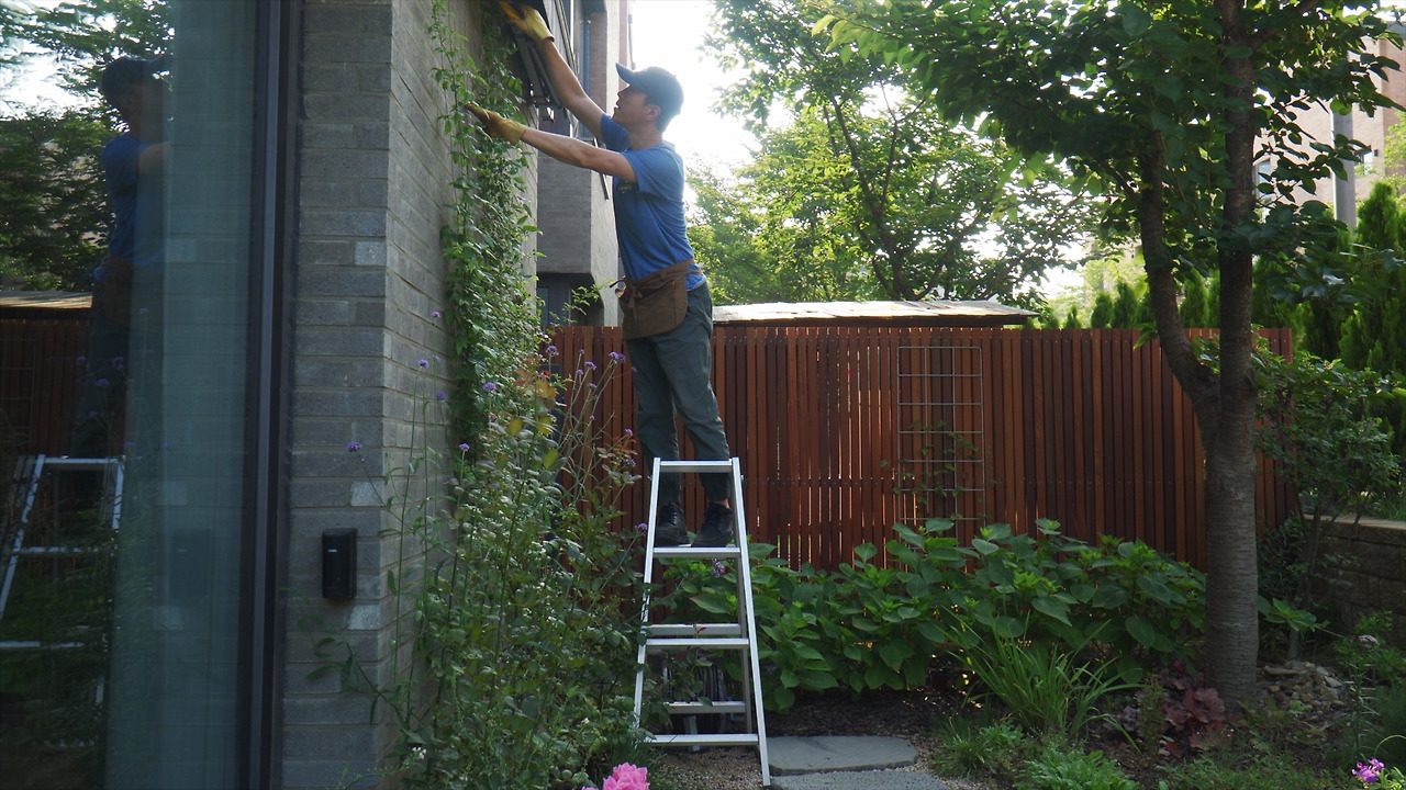 벽을 타고 높이 높이 올라간 덩굴장미 보니의 신장지를 비가 잠깐 멈춘 사이에 사다리를 타고 올라가 잘라 주었다. 그리고 또 여기저기 앞으로 불쑥 튀어나와, 내가 마당을 왔다 갔다 움직일 때 방해가 되는 가지들도 정리했다.