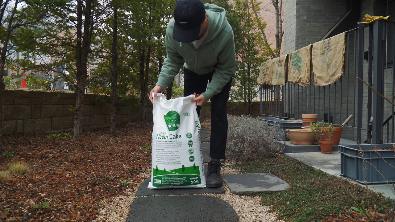 일 년에 장미에게 세 번만, 일 년에 수국에게 두 번만 비료룰 주면 되지만 한 달에 두 번 주려고 하는 것이 바로 '님케이크'다. 물에 희석해서 뿌리면 병해충 예방 효과가 있다는 님 열매의 오일을 짜고 남은 찌꺼기를 유박처럼 만든 것이 님케이크다.