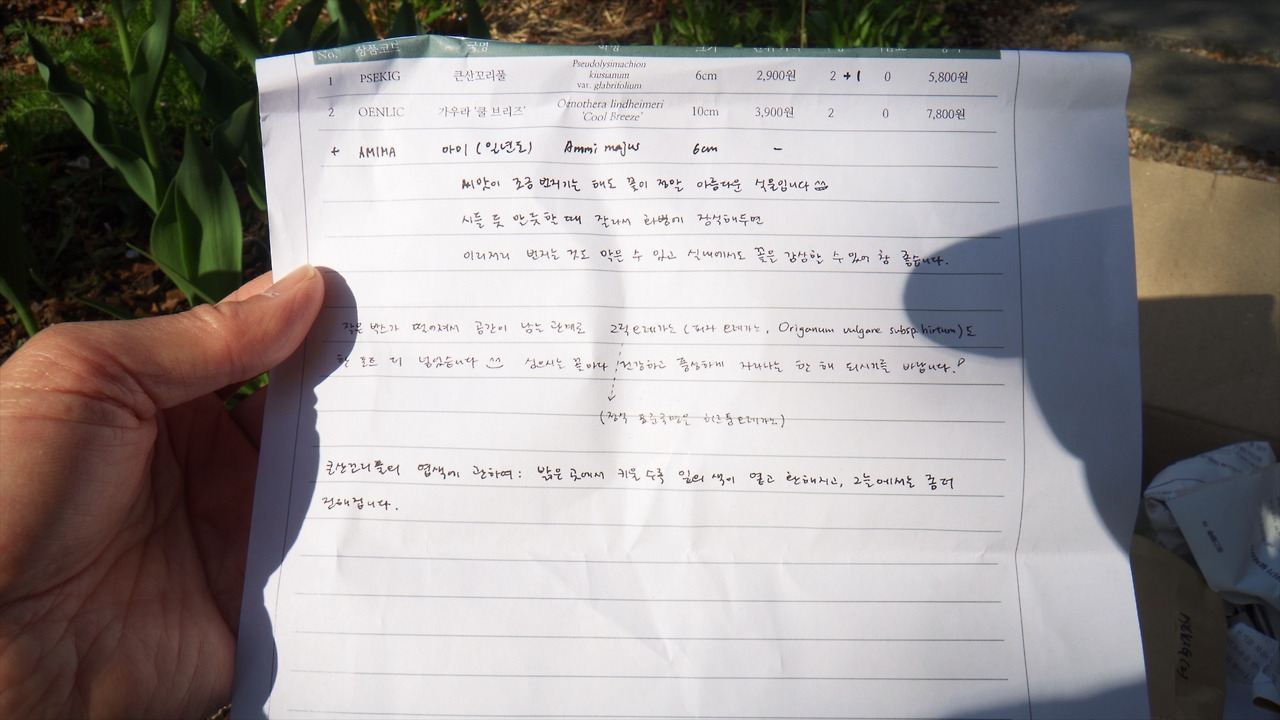 반음지 구역 솔체를 뽑아낸 자리를 채울 큰산꼬리풀과 매년 월동에 실패하지만 올해도 노지월동에 또다시 도전해 보는 나비 바늘꽃 '가우라 쿨 브리즈'라는 녀석을 '오월들꽃'이라는 곳에서 데려왔다. 정성스러운 포장과 튼실한 모종, 마음이 따듯해지는 손편지와 디테일한 설명에 감동받아 앞으로도 종종 이용할 예정이다.