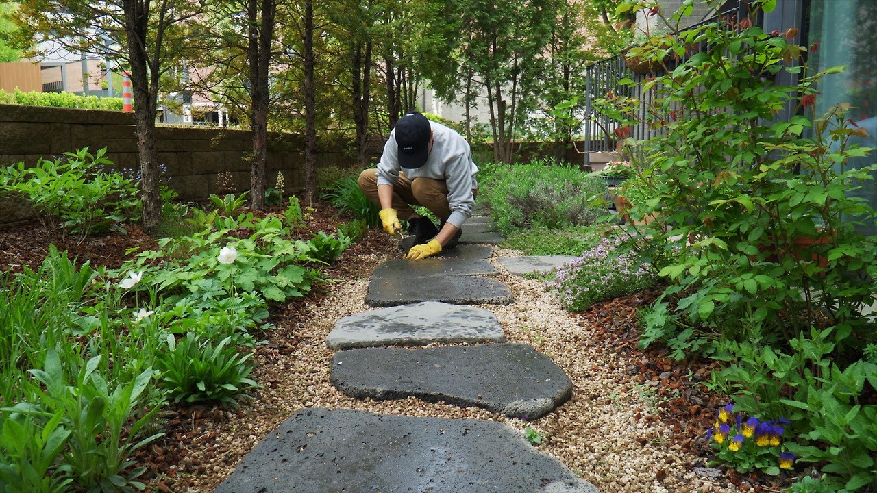 하지만 이렇게 미니 정원을 새로운 꽃으로 채우기만 한 것은 아니다. 4월 중순이 되면서 디딤석 주변의 마사토 위로 잡초인지, 지난해 꽃들의 새싹인지 알 수 없는 정체불명의 아이들이 엄청나게 나타나기 시작했다.