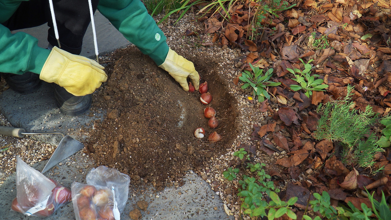 튤립 구근을 모아서 심고 있다