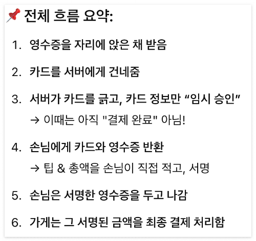 **카드 정보(승인 코드)**를 식당이 이미 확보했기 때문에, 손님이 나간 뒤라도 영수증에 적힌 팁대로 금액을 수정해서 청구할 수 있습니다.
