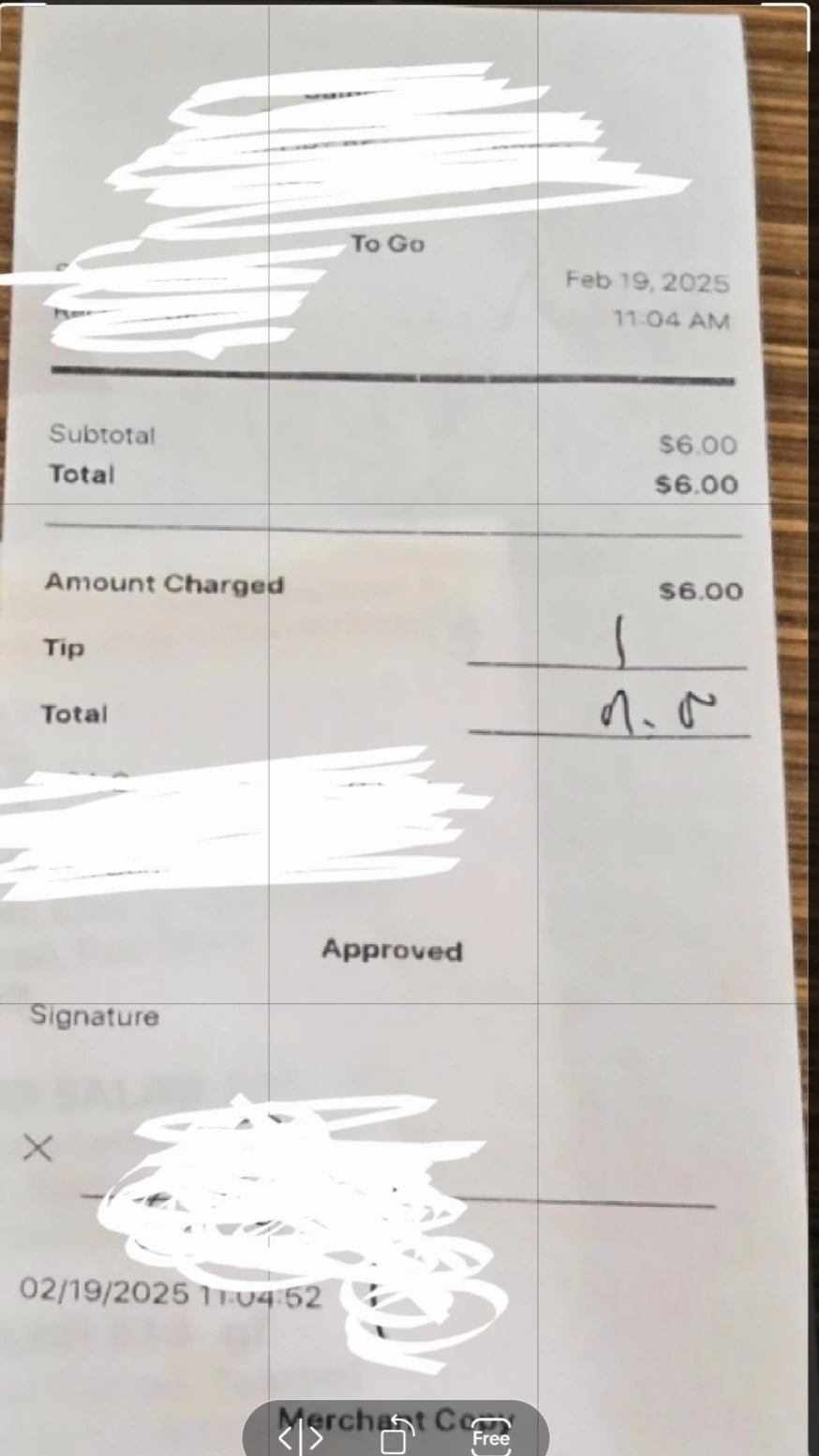 2. ✍️카드가 찍힌 영수증에는 "tip"과 "total"칸이 비어있음. 손님이 직접 팁 금액과 최종합계를 적고, 서명을 함.