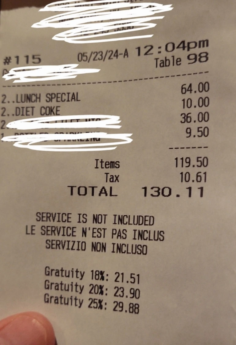 보통 영수증을 받으면 저렇게 음식 가격이 기재되어 있고, 팁과 토털금액을 손님에게 적으라고 한다. 밑에는 서명란이 있다.