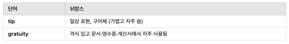 gratuity: 영어로 팁이라는 뜻입니다.(tip) 서비스에 대한 감사의 표시로 주는 돈, 다른 말로는 "봉사료"가 되겠네요.