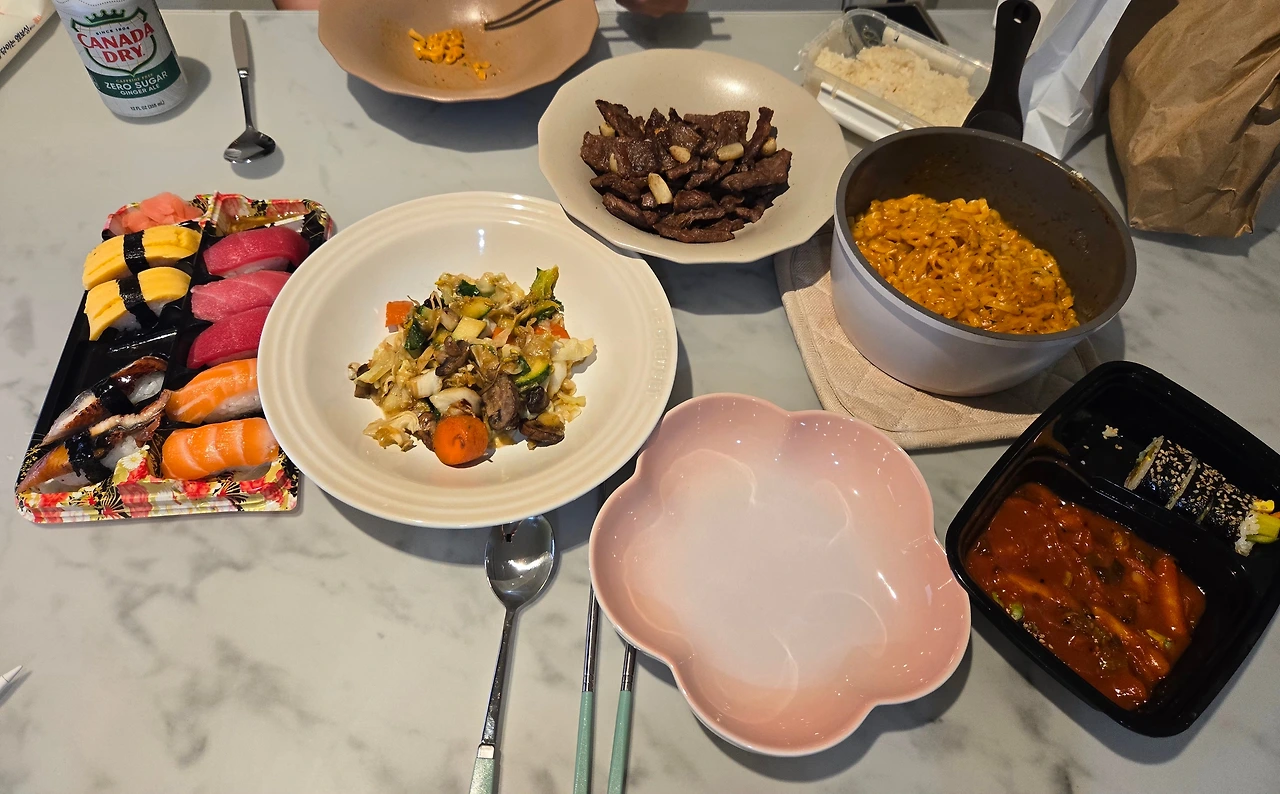 까르보불닭이며 소고기, 귀하신 몸인 떡볶이와 김밥, 초밥들까지 아주 조촐한 파티를 벌이기도 했습니다.