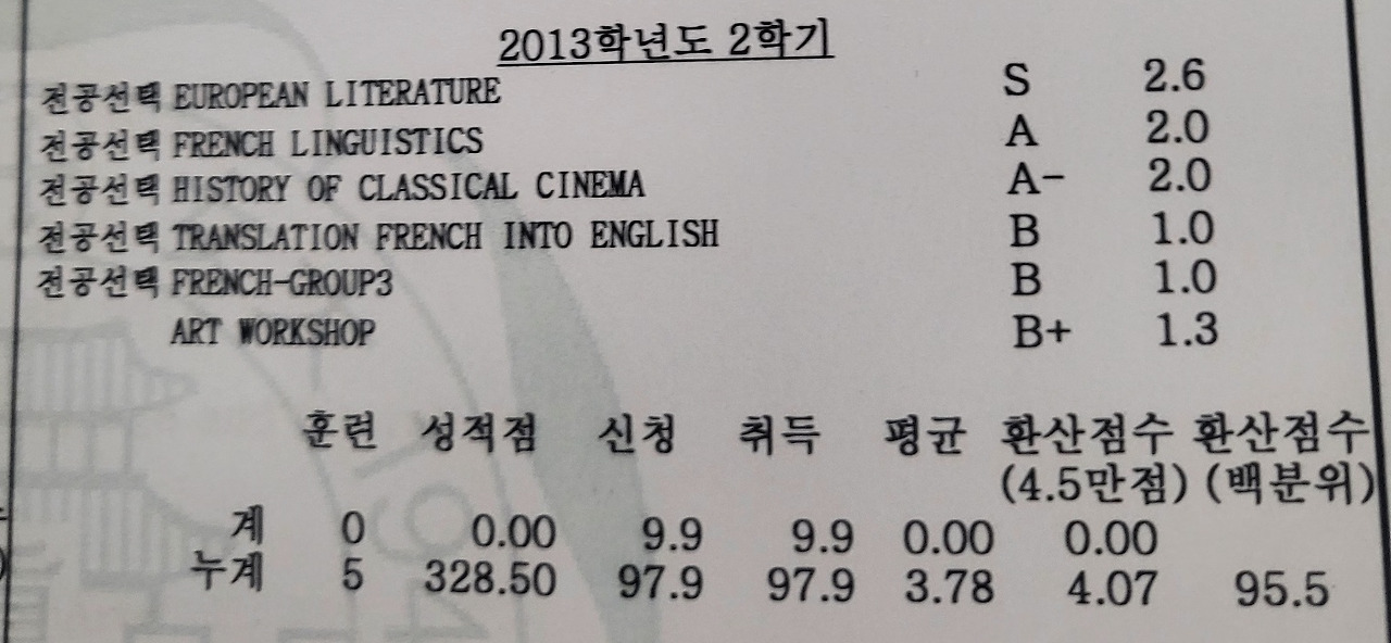 처참했던 어학과의 싸움. FRENCH GROUP SPEAKING B, FRENCH 번역 B. (대학성적표) 나는 어문학도가 아니라 인문학도였다. 라고 믿고 싶었다...