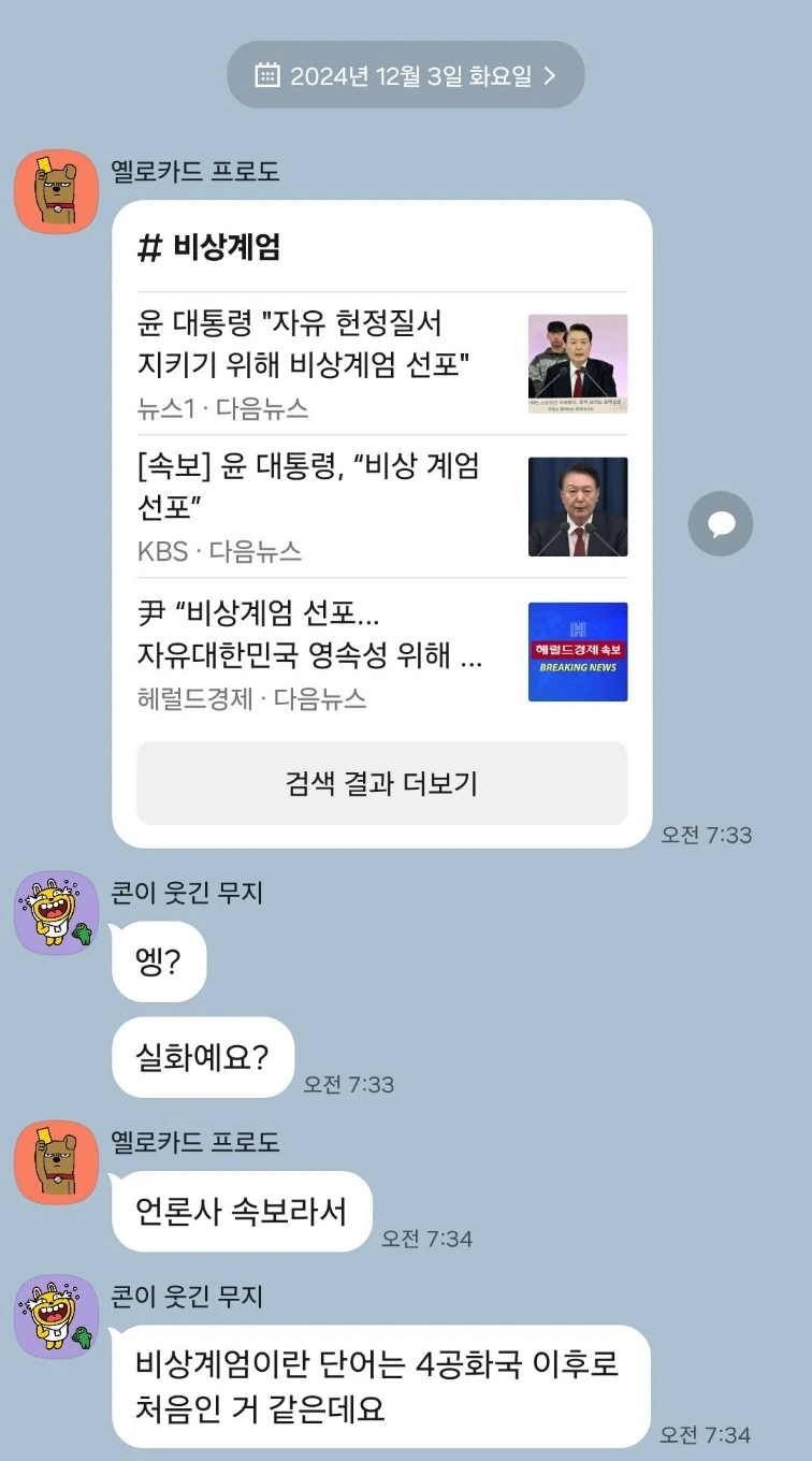 역시나 미국에서도 비중있게 다루더라고요. 특히 외국인 친구들은 martial law 라는 것 자체가 뭔지 몹시 혼란스러워하며, 이거 north 아니고 south korea 이야기 맞냐고 수차례 되물었습니다...참 뭐라고 얘기해야할지.