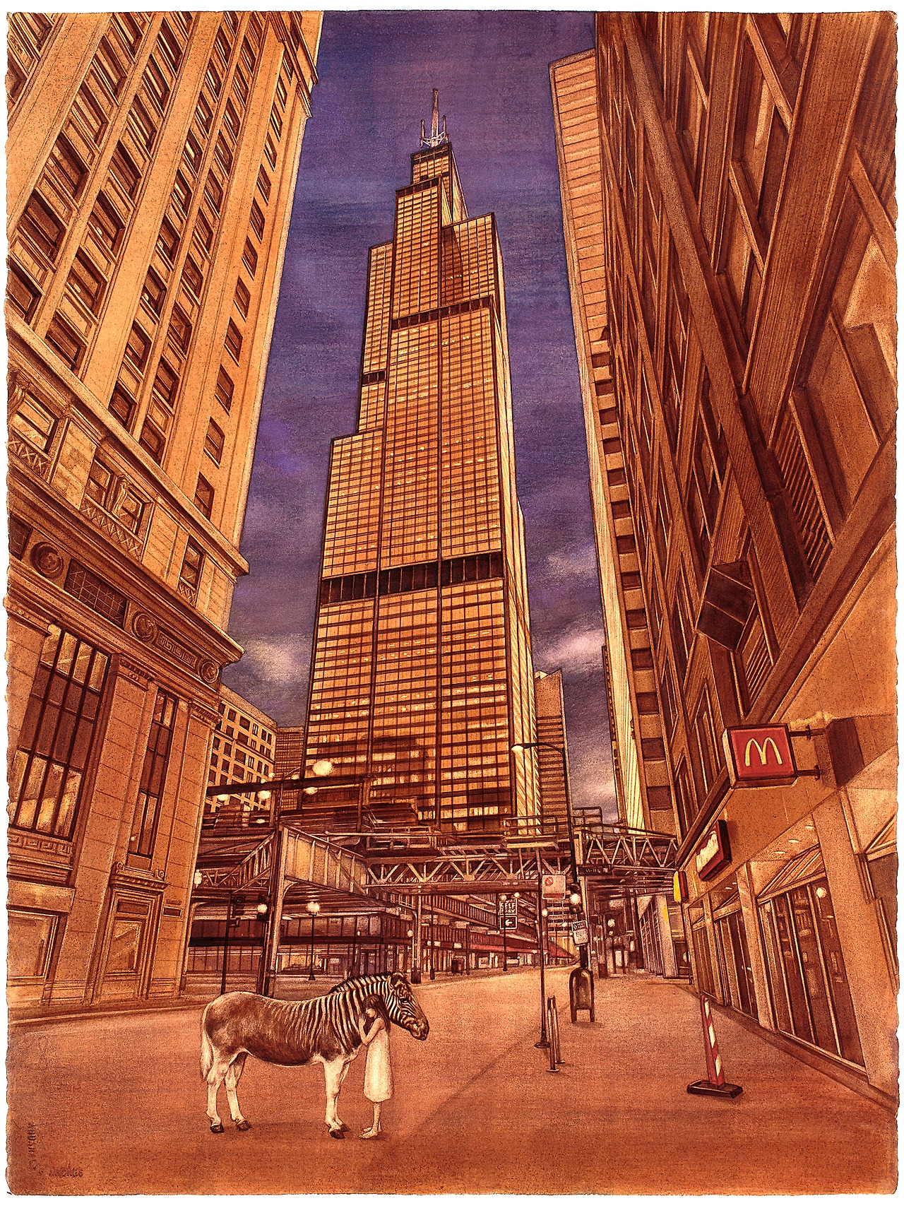 콰가를 꼭 끌어안고 어루만지는 소녀의 그림에 자연을 아끼고 사랑했던 인디언들의 마음을 담았다. 뒤편에 보이는 건물은 1974년에 시카고에 들어선 지상 108층, 높이 442.1미터의 윌리스 타워로 1998년, 말레이시아에 페트로나스 트윈타워가 준공되기 전까지 세계에서 가장 높은 초고층 빌딩이었다. 인디언을 멸망시키고 차지한 땅에 쌓아 올린 초고층 빌딩들. 왜 백인들은 인디언들에게서 평화로운 삶의 방식을 배우지 못했을까. 왜 그토록 자연을 사랑하는 아름다운 문명을 멸망시켰을까.