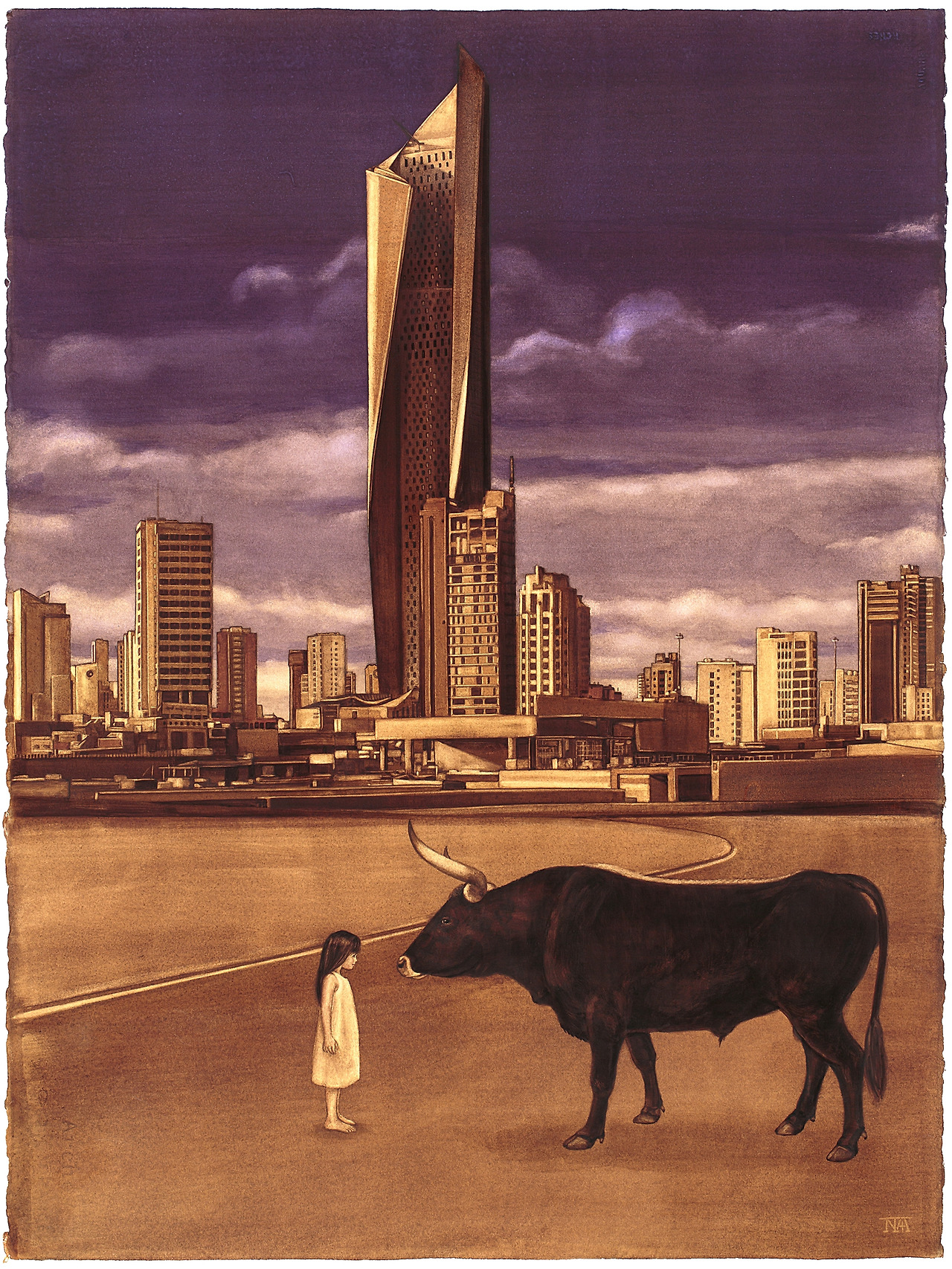 그림을 시작할 때는 내가 소녀와 동물을 왜 이렇게 배치하고 구성하는지 모를 때가 많다. 그림을 완성하고 나서야 표현하고 싶었던 것이 무엇인지 깨닫곤 한다. 그림 속 소녀는 오록스의 등에 올라타고 오록스가 아주 많았던 시대로 여행을 떠나고자 한다. 자신을 태워 줄 수 있는지 오록스에 물은 후 그 답변을 기다리고 있다. 그런 소녀를 바라보며 미소를 짓는 오록스의 표정은 소녀의 청에 대한 답변이다. 그림 속 배경이 되는 건물은 쿠웨이트에서 가장 높은 초고층 빌딩인 알 함라 타워다. 지상 80층에 높이 412.6미터로 2011년에 완공되었고 현재 세계에서 열입곱 번째로 높다.