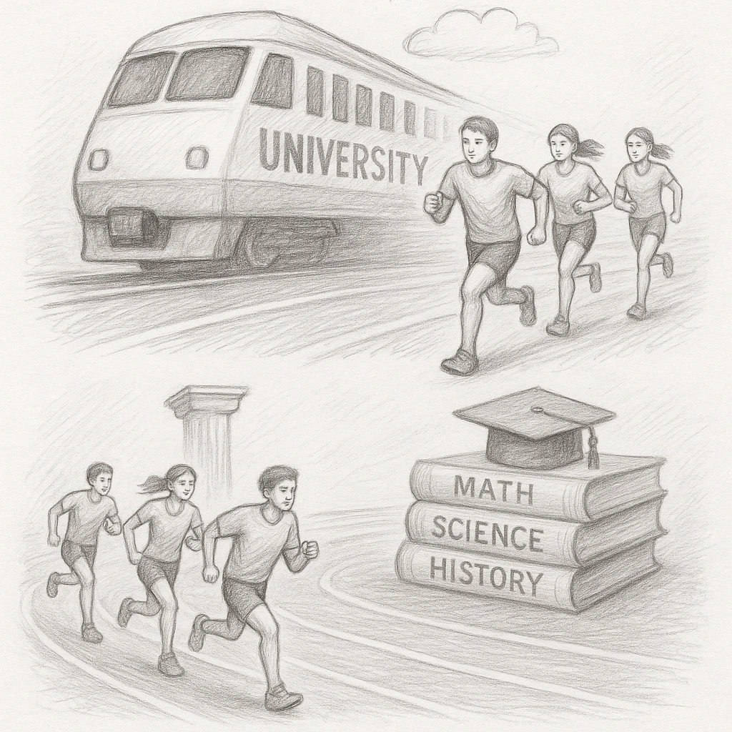 더 큰 문제는, 모두가 달리는 순간 생긴다. 내가 전력질주하면 앞에 나갈 수 있을 것 같지만, 옆사람도, 뒷사람도, 앞사람도 똑같이 전력질주한다. 그래서 결과는? 모두가 제자리다. 순위는 그대로인데, 남는 건 지칠 대로 지친 몸과 마음뿐이다. 한국 교육은 거대한 러닝머신이다. 열심히 달리지만 풍경은 바뀌지 않고, 체력만 소모된다.