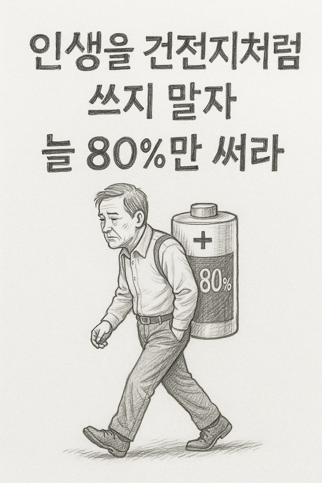 전기차도 그렇다. 배터리 100%로 충전하면 수명이 줄어들고 위험하다고 한다. 그래서 80%까지만 채워 쓰는 게 좋다. 사람도 마찬가지다. 늘 80까지만 채워야 오래 쓴다. 에너지 관리 못 하면, 수명보다 먼저 내 삶이 고장 난다.