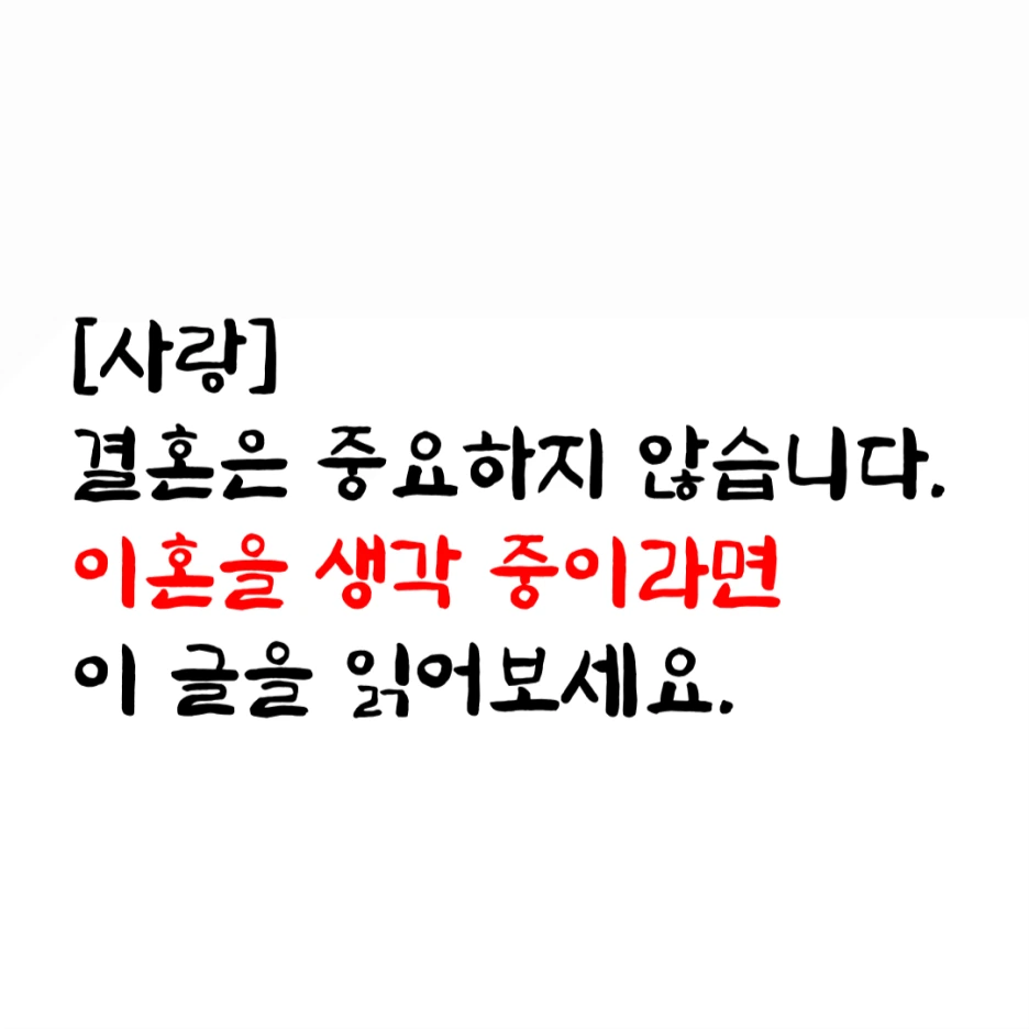 따라서 이혼할까 무서워 결혼을 꺼린다면 앞뒤가 맞지 않습니다. 죽고 싶지 않아 살지 않겠다는 말이니까요. 이혼은 결과입니다. 목적이 될 수 없습니다.