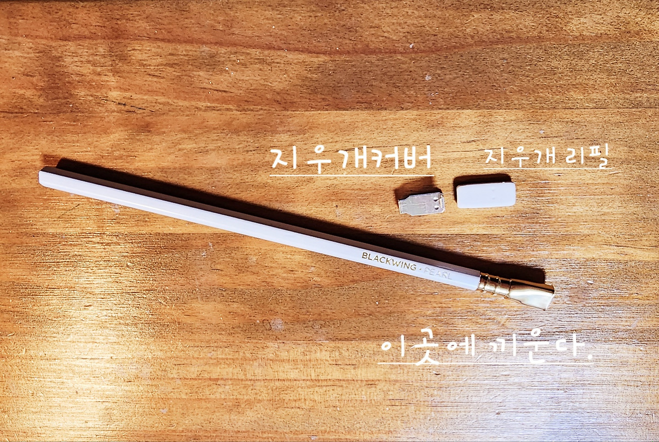 참 이렇게 귀여울 수 있을까? 지우개를 바꾸어 끼우려면 한다면 먼저 커버(알루미늄 재질) 벌린다. 긴 쪽으로 열려 디귿자가 되는데, 열리는 공간 쪽에 지우개 리필을 넣고 연필 끝부분에 있는 홈으로 끼워 넣으면 된다. 연필 바디색은 흰색, 검은색 그리고 분홍과 산호색 중간쯤 되는 여성스러운 색이 하나 더 있다. 연필을 종류별로 한가득 있는데 그래도 최애는 불행하게도 블랙윙이 아니다.