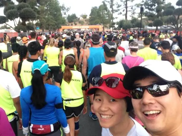 2014년 엘에이 마라톤 출발선에서 아내와 함께. 뛰기 직전이라 그런지 참 해맑다.