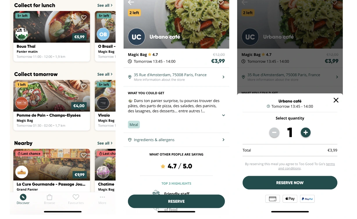 물론 아쉬운 부분도 몇가지 보여. 음식이 남게될지 아닐지 모르는 식당 특성상 선택지가 그렇게 넓지는 않아. 프랑스에서 내가 사용해 봤을때는 대부분이 빵집들 위주였어서 식사다운 식사를 선택할 기회가 그렇게 많지는 않았어. 또 유럽은 한국에 비해 여러가지 음식 알러지나 베지테리언, 비건 등 음식에 대한 선택 기준이 까다로운 편인데, 내가 뭘 수령할지 정확히 알 수 없다는 점이 가장 큰 단점으로 보였어. 내가 알러지가 걱정된다면 식당에 직접 전화해서 확인해보는 방법밖에는 없지. 이러한 이유 때문에 나는 투굿투고가 주문하는 과정을 ‘매직백’으로 네이밍하여 하나의 랜덤박스를 받아본다는 식으로 브랜딩한 점이 좋았어. 한마디로 무엇을 받을지 모르는 이 불확실함을 기대감으로 가리는 의도인거지. 특히 장을 볼때는 정말 마트에서 어떤 제품들을 받게 될지 몰라 그때 그때 테스트해보는 재미가 있어. 물론 내가 원하는 제품이 확실하게 있을때는 그다지 적절치 않는 서비스일거야.