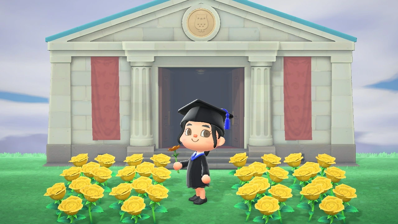 최근 친구들 중 가장 먼저 졸업한 친구 S를 위해 졸업식을 준비했다. 코로나로 인해 가운 대여 사업도 잠정 중단되어서, 학사모도 못 쓰고 졸업해버린 S에게 바친다. 우연인지 운명인지 동물의 숲의 박물관이 모교의 본관과 매우 비슷한 모양이었다. 부엉이 관장님 덕에 더 친근했달까.. 노란 장미의 꽃말은 여러 가지가 있지만, 그중에 내가 전하고 싶은 말은 ‘완벽한 성취’였다. 우리의 5년이 모두 충실한 시간이었길 바란다. (사실 노란 장미꽃이 가장 많아서 어쩔 수 없는 선택이기도 했지만 사족을 붙여봤다.) 가장 먼저 졸업을 축하해
