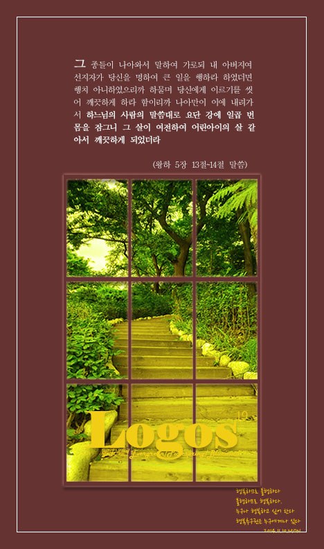 그 종들이 나아와서 말하여 가로되 내 아버지여 선지자가 당신을 명하여 큰 일을 행하라 하였더면 행치 아니하였으리까 하물며 당신에게 이르기를 씻어 깨끗하게 하라 함이리까 나아만이 이에 내려가서 하느님의 사람의 말씀대로 요단 강에 일곱 번 몸을 잠그니 그 살이 여전하여 어린아이의 살 같아서 깨끗하게 되었더라