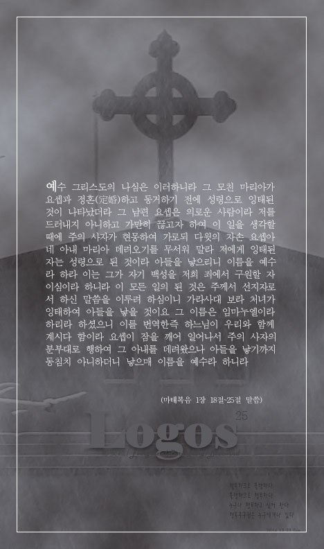 예수 그리스도의 나심은 이러하니라 그 모친 마리아가 요셉과 정혼(定婚)하고 동거하기 전에 성령으로 잉태된 것이 나타났더라 그 남편 요셉은 의로운 사람이라 저를 드러내지 아니하고 가만히 끊고자 하여 이 일을 생각할때에 주의 사자가 현몽하여 가로되 다윗의 자손 요셉아 네 아내 마리아 데려오기를 무서워 말라 저에게 잉태된 자는 성령으로 된 것이라 아들을 낳으리니 이름을 예수라 하라 이는 그가 자기 백성을 저희 죄에서 구원할 자이심이라 하니라 이 모든 일의 된 것은 주께서 선지자로서 하신 말씀을 이루려 하심이니 가라사대 보라 처녀가 잉태하여 아들을 낳을 것이요 그 이름은 임마누엘이라 하리라 하셨으니 이를 번역한즉 하느님이 우리와 함께 계시다 함이라 요셉이 잠을 깨어 일어나서 주의 사자의 분부대로 행하여 그 아내를 데려왔으나 아들을 낳기까지 동침치 아니하더니 낳으매 이름을 예수라 하니라