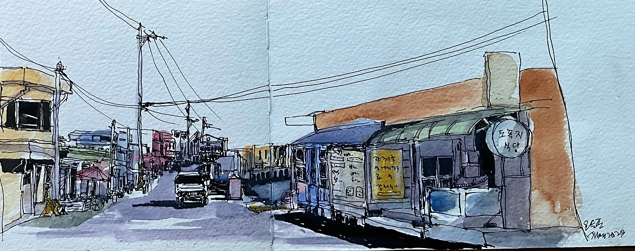 나는 펜을 움직이며 이 골목의 여유와 온기를 천천히 담는다.