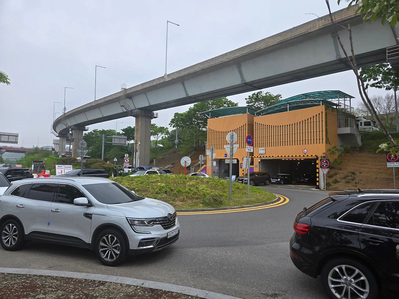 공영주차장 일부가 공사 중이었고, 일요일이라 한강을 즐기러 온 시민들의 차가 길게 대기 중이었다.