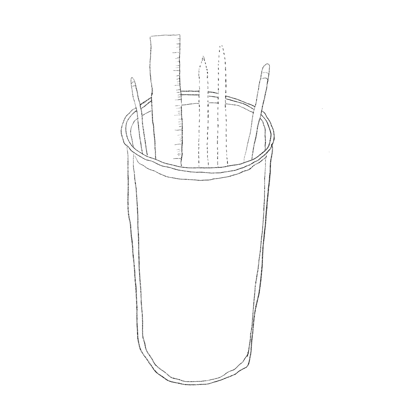 어질러진 연필, 형광펜을 연필꽂이에 넣고