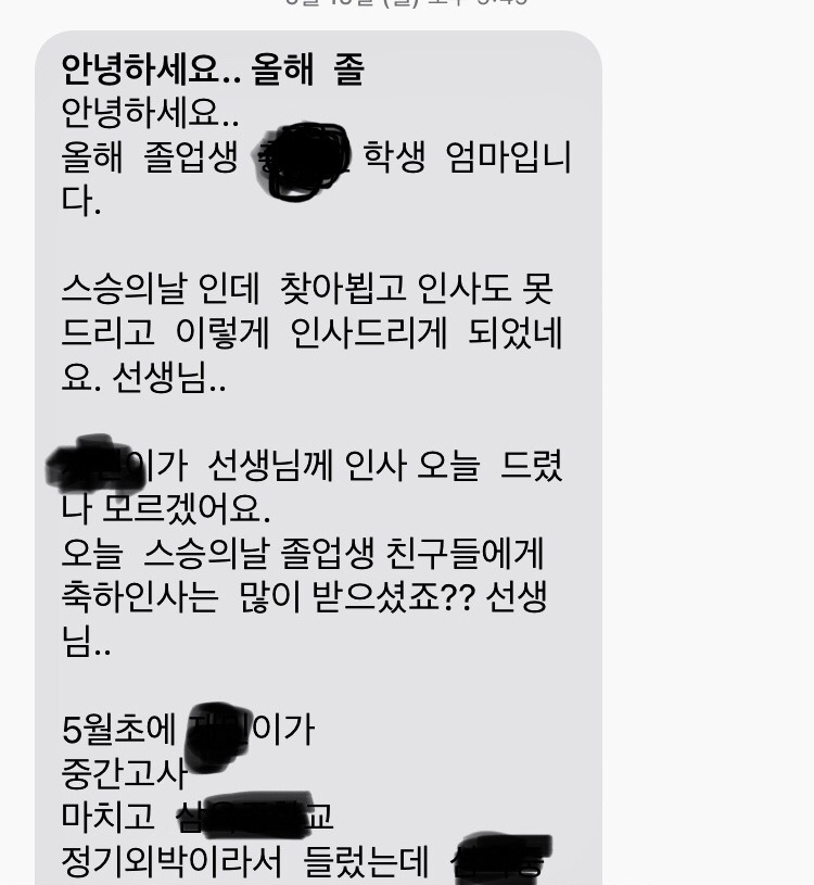다음 해 저는 육아휴직을 했고 그 남학생은 3학년을 보내고 졸업했습니다. 올해 스승의 날 그 어머니께 문자가 왔습니다. 용건이 있는 것이 아닌데도 졸업한 뒤에 연락 주시는 분은 처음이었습니다.