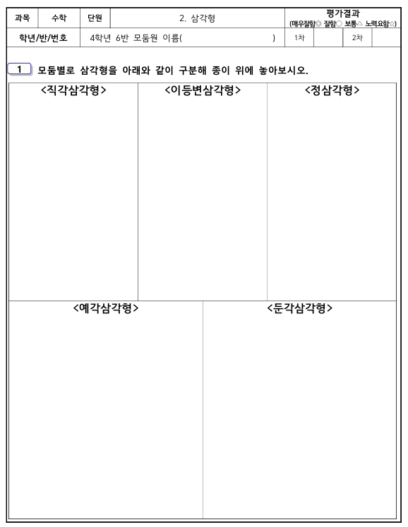 아래 사진은 올해 제가 냈던 수학 수행평가입니다(이게 꼭 모범적인 경우는 아닐 겁니다^^ 그냥 예시로 넣었습니다.). 다양한 삼각형을 배우고 나서 한 평가입니다. 이 수행평가지를 B4사이즈로 확대해서 모둠별로 1장씩 나눠줍니다. 그리고 제가 색상지를 잘라서 만든 아주 여러가지 삼각형을 모둠별로 20여개씩 나눠줍니다. 그리고 모둠 아이들이 서로 얘기하고 의논하면서 삼각형이 해당하는 칸에에 붙이는 겁니다. 다 마치고 나서 모둠별로 가지고 나오는데 저는 묻습니다. "이걸 하면서 다툼은 없었나요?""모두가 고르게 잘 붙였나요?" 그래서 수행평가는 꼭 개별 학습지로만 보는 게 아니고, '협력적 문제해결력'을 강조하기도 합니다. 수행평가는 작성하는 선생님에 따라 창의적으로 다양하게 이루어집니다. 요즘은 학생별 각 1대의 태블릿을 사용할 수 있는 상황이라, 사회시간과 과학시간에는 조사하여 답하는 수행평가도 있습니다. 올해의 경우 과학시간에 배운 여러 행성에 대해, 그리고 다양한 기체의 성질에 대해 태블릿으로 조사하여 답하는 수행평가도 있었습니다. 지금은 AI도 등장하고, 정보가 넘치는 시대기 때문에 이전처럼 단순한 암기보다는 협력, 소통, 문제해결 등을 포함한 평가방식이 등장합니다. 그리고 보다 나은 수행평가를 위해 교사들도 수시로 평가에 관한 연수를 듣기도 합니다.