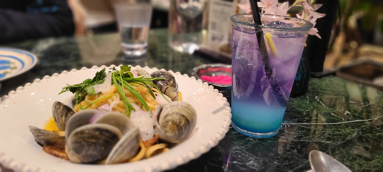 봉골레 파스타와 화덕피자, 블루멜로우(정말 보기만 해도 행복한 예쁜 음료)를 주문했다. 주말이라 사람이 많아 많이 기다렸지만 역시, 좋았다. 여의도점에서는 물 잔도 음료 잔도 다 유리유리했는데, 여긴 모두 플라스틱이다. 여러 가지로 몹시 아쉽지만 그래도 그 흔적을 볼 수 있는 곳을 만나서 정말 반가웠다. 천장에 좀 지나치다는 느낌이 들 정도로 빼곡히 달린 샹들리에만 보면서도 충분히 기다릴 수 있었다. 음식은 다 맛있었다.