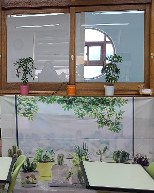 그리고 창문 쪽엔 4~5개의 화분은 놓는다. 작아도 식물이 주는 편안함과 안정감이 있다. 특히 창문에 두면 보는 기분이 좋다. 이 화분들은 2020년 봄에 샀으니 꽉 차게 6년이 되어간다. 분갈이를 해주면 더 커질 텐데, 교실 안에서의 조화상 그대로 두니 화분이 거의 뿌리로만 가득 찼다. 제일 건강하게 자라고 있는 건 셰프렐라홍콩야자다. 테이블야자는 5년이 지난 작년부터 시들시들해지는데 셰프렐라홍콩야자는 혼자 건강하다. 교실이 환기도 채광도 좋지 않은데 오래 살아주어 고마울 뿐이다.