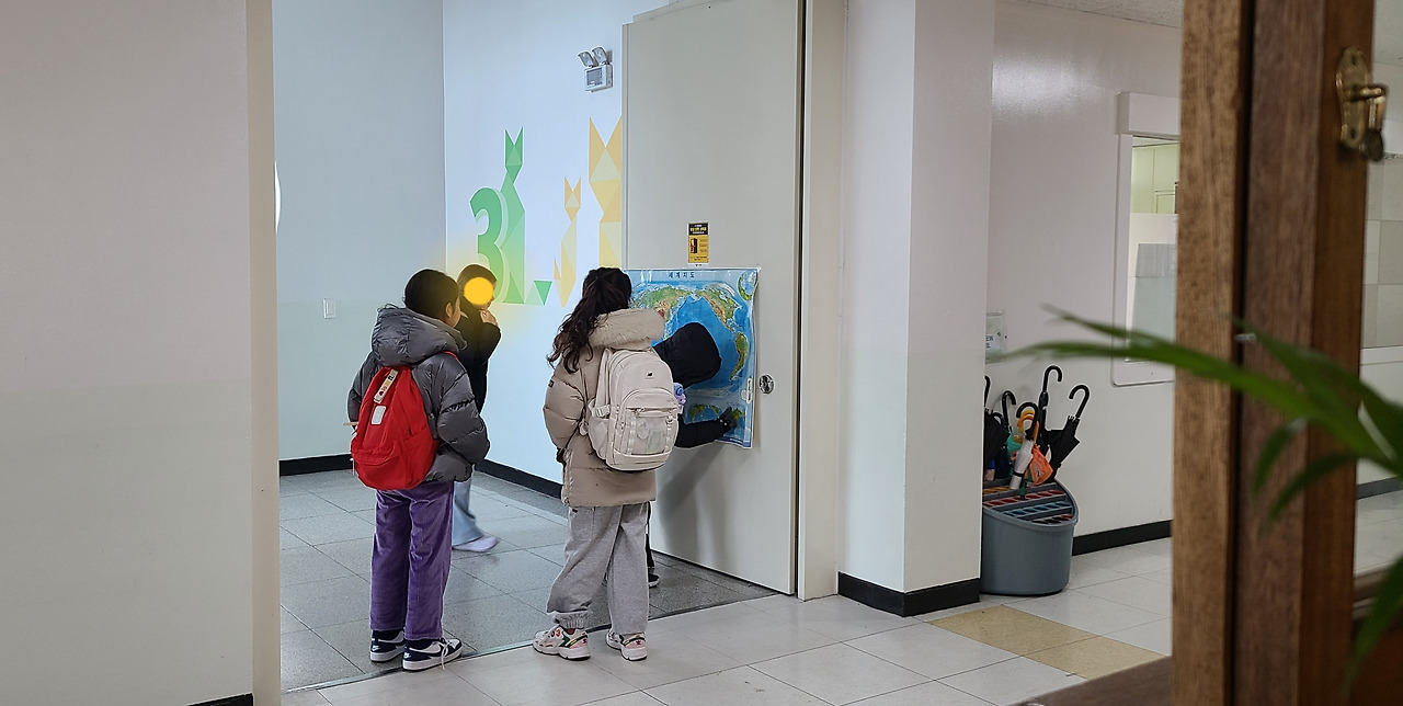 위는 우리 반 아이들이 오후에 집에 가면서 지도를 보는 장면이고, 아래는 오늘 아침 등교하는 5학년들 사진이다. 5학년은 우리 교실보다 한 층 위에 있는데 올라가다가 멈춰서 보는 게 너무 귀여웠다. 한참을 보면서 속닥거린다.
