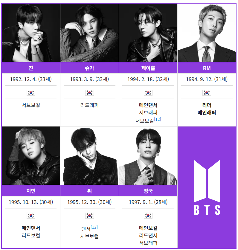 BTS는 2013년 6월 13일에 데뷔한 대한민국의 빅히트 뮤직 소속 7인조 보이그룹이다. 방탄소년단(防彈少年團)이란 이름에서 방탄은 '총알을 막아낸다'라는 뜻이 있다. "10대들이 살아가면서 겪는 힘든 일, 편견과 억압을 우리가 막아내겠다는 심오한 뜻을 담아냈다"라고 밝혔다. (위 글과 아래의 멤버 소개 사진 출처: 나무위키)