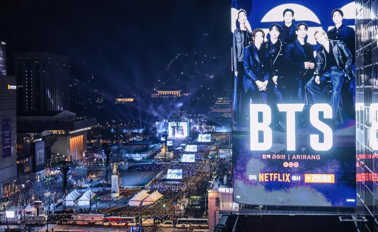 (사진 출처: 21일 서울 종로구 광화문광장에서 BTS 컴백 라이브: 아리랑‘(BTS THE COMEBACK LIVE | ARIRANG)이 열리고 있다. 2026.03.21 사진공동취재단© 경향신문)