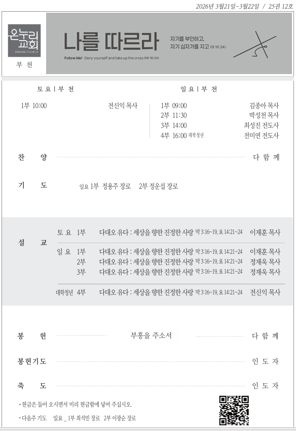 우리 교회에서는 주일 예배를 총 4번 드린다. 토요일 10시, 그리고 일요일 1부는 9시, 2부는 11시 반, 3부는 오후 2시 이렇게다. 나는 일요일 2부 11시 반 예배에 10분 전에 도착했다. 들어가면 1층에서 안내하시는 분 세 분이 엘리베이터 앞에서 나란히 인사해 주신다.