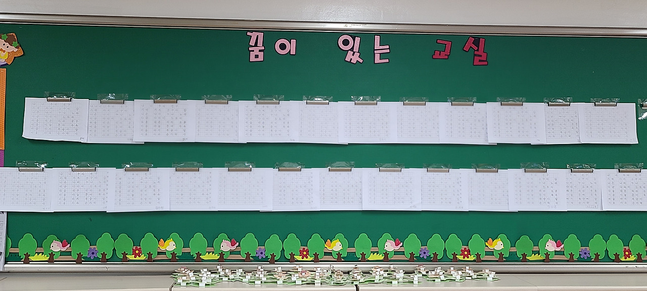 "집에서 안 쓰는 글씨 쓰기 공책 있으면 보내주세요. 없으면 사지는 말고 그냥 옵니다. 없는 사람은 인쇄해서 줄게요." 아이들에게 말하고 알림장에도 적는다. 그러자 25명 중 15명 정도는 공책을 가져오고, 나머지는 글씨 쓰기 공책모양의 종이를 인쇄해서 칠판 아래에 둔다. 그리고 글씨 쓰기에 대한 교육과 글씨 쓰기가 연일 계속된다.