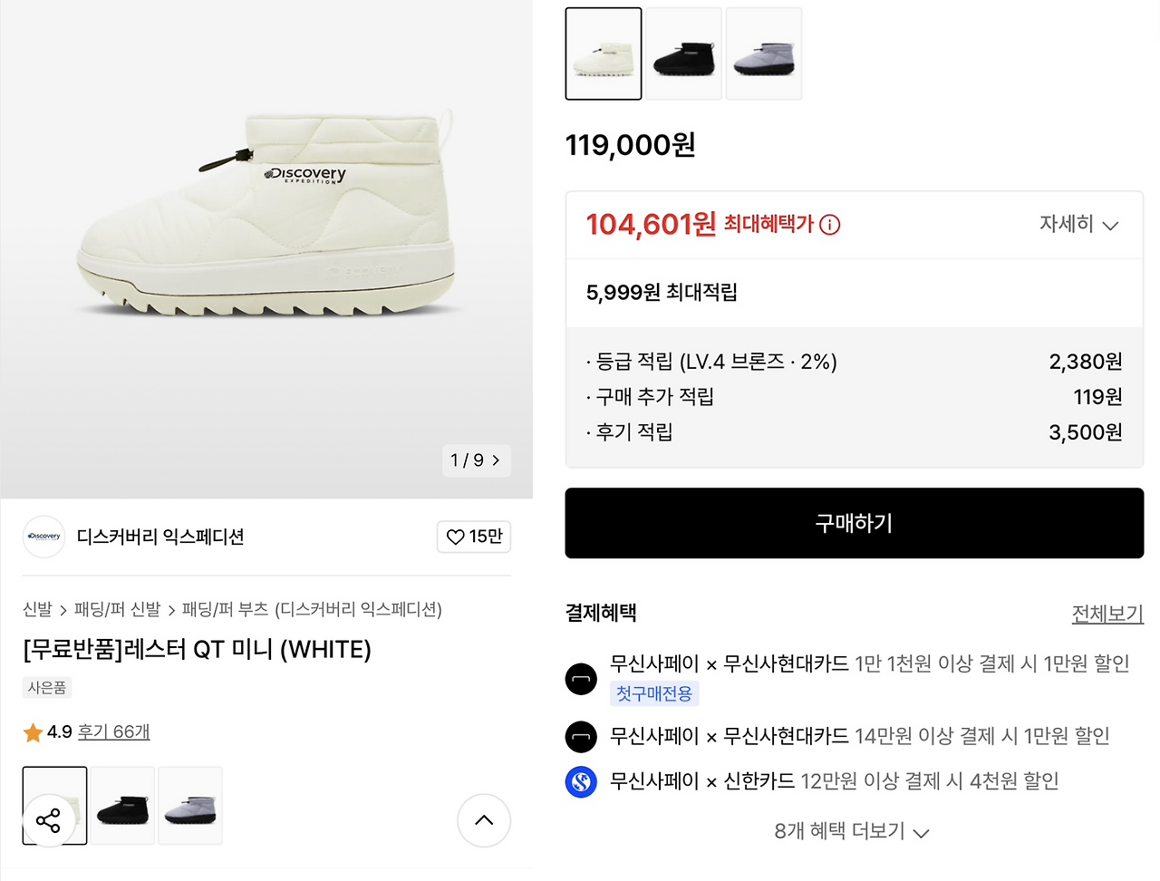 개인적으로 디스커버리에서 나온 패딩 부츠 굉장히 좋았어요! 이거 신은 날에는 안 넘어졌다네요^^