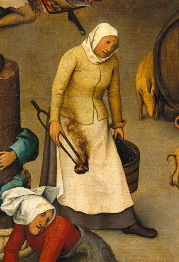 머리에 흰 두건을 쓴 여인이 한 손에는 불이 붙은 석탄을 한 손에는 물동이를 나르고 있다.