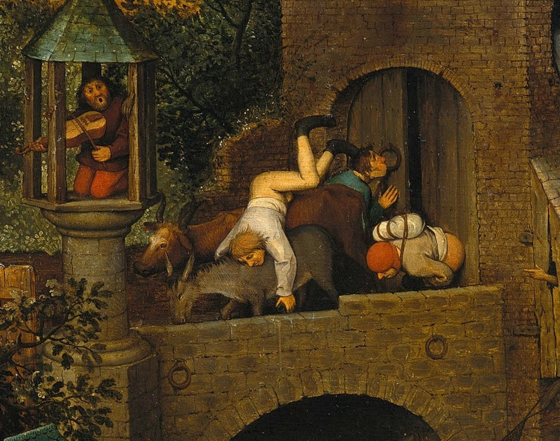 소 아래로 떨어지는 사람은 '황소 엉덩이쪽에서부터 떨어지다.'라는 속담을 나타낸 것으로 '어려운 상황에 처하다.'라는 의미라고 합니다. 그렇겠네요. 그 옆에 현악기를 연주하는 사람이 보이는데요. '기둥에서 악기를 연주하다.'라는 속담은 '다른 사람의 수치스러운 행위에 주위를 끌다'라는 표현인데요. 가십을 동네방네 떠들고 다닌다는 의미가 아닐까 합니다.