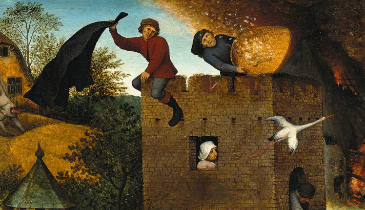 이번엔 그 아래 성 주변에 있는 사람들을 살펴볼까요? 먼저, 성 안에서 창밖으로 황새가 날아가는 것을 바라보고 있는 여인이 있죠? '황새를 바라보다.'라는 속담은 '시간 낭비하다'라는 의미라고 합니다. 멍 때리는 건 시간낭비이긴 하죠.