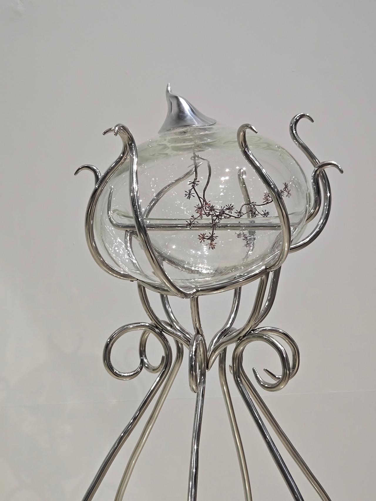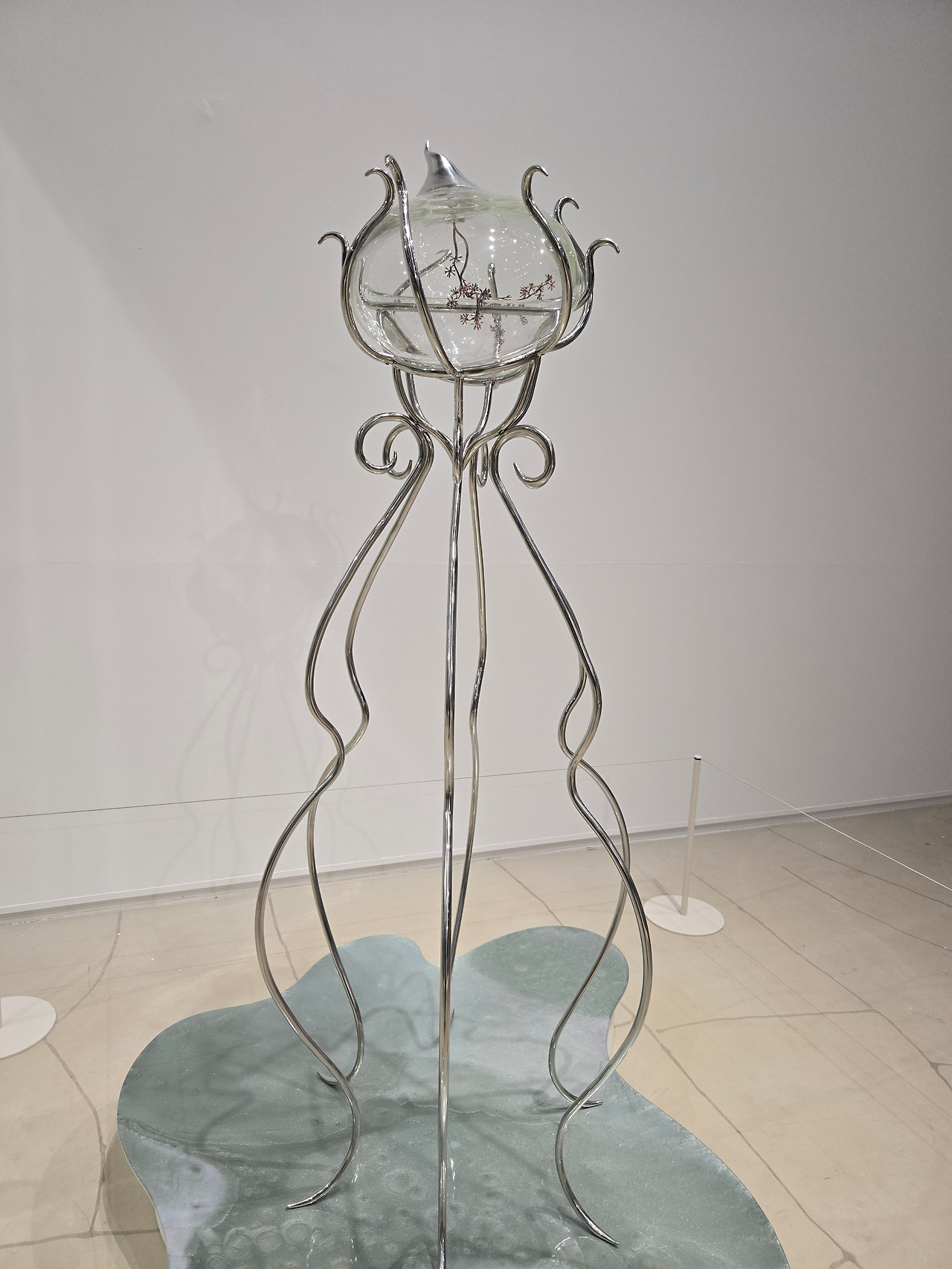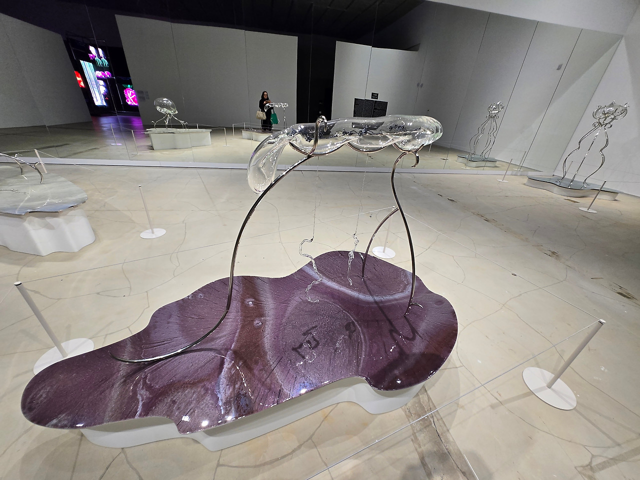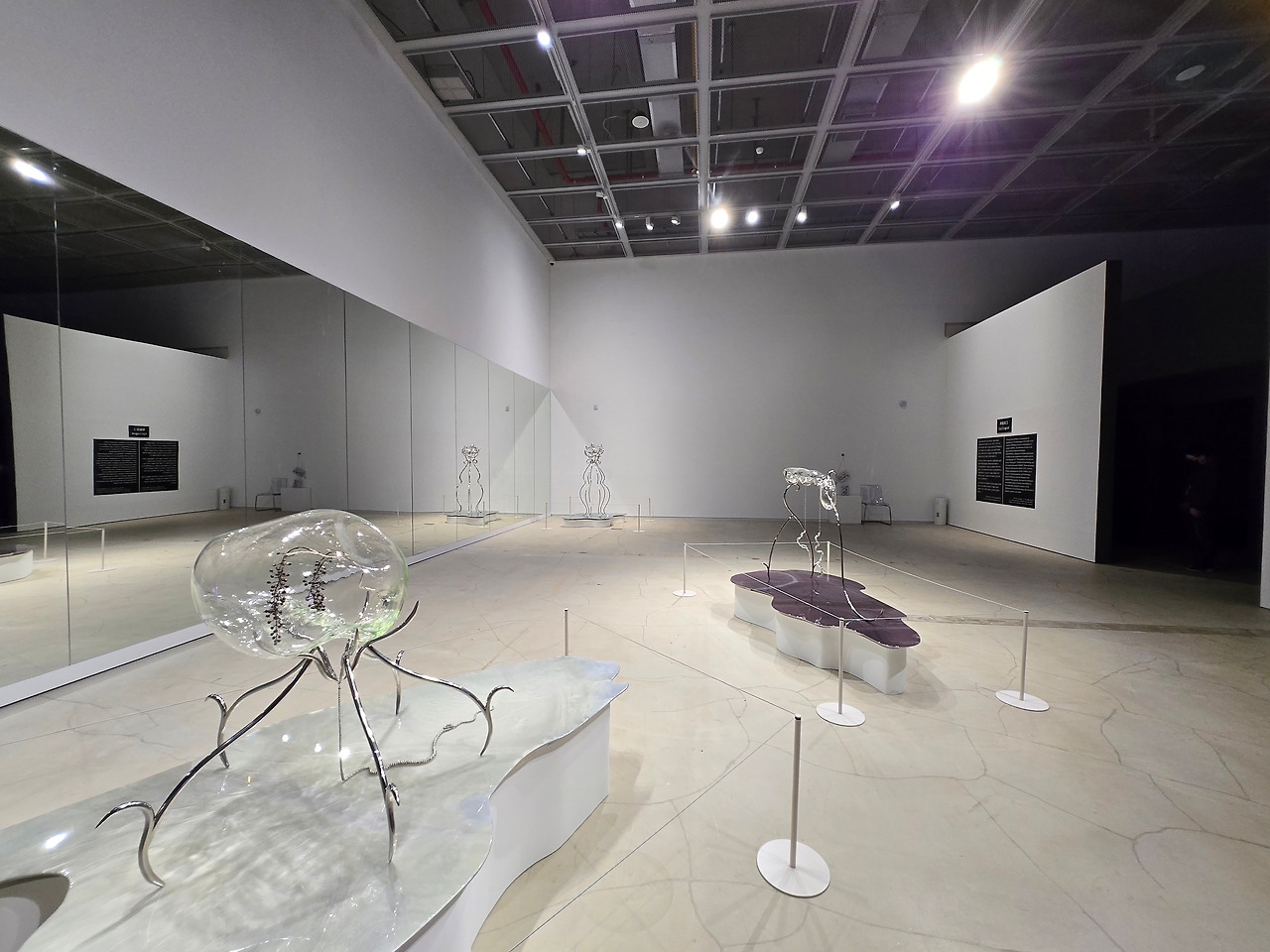 <누드 핼루시네이션>이라는 제목으로 #1부터 #3까지 번호를 매겨두었다. 커다란 거울 앞에 세워진 투명한 유리 작품 3점은 '타자 간의 기억의 전이'를 표현한 것이라고 했다. 이 작품은 뇌세포 연구의 일환으로 진행된 기억 이식에 성공한 바다달팽이 실험에서 착안했다고 하는데, 이 실험에 이용되었던 바다달팽이를 지성체(知性體)이자 수서인(水棲人:물 속에 사는 사람)으로 상상하여, 그 형태를 유리 조형으로 표현했다고 한다. 유리 작품과 이를 받치고 있는 고강도 스테인리스 구조물은 상반된 재질이라는 것이 특징이다. 일견 투명하고 힘을 가하면 깨지는 유리와 단단하고 불투명한 금속인 스테인리스는 완전히 다르지만 고온에 다다르면 끈적한 액체로 변한다는 공통점을 가지고 있는데 이 역시 작품에서 의도된 부분이라고 한다. 작가의 상상력이 부유하는 작품이라 과학과 인공지능이라는 것보다는 아름다움이 두드러지는 작품이었다.