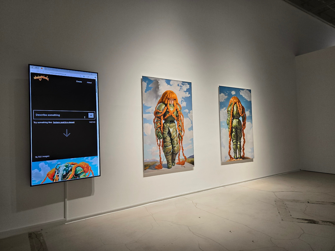 작품 속 인물의 모습은 작가인 홀리 헌던의 모습을 기반으로 만든 것인것 같다. 홀리 헌던의 모습이 전시된 작품 옆에 커다란 태블릿이 비치되어 있다. 여기에 프롬프트를 입력하면 태블릿 상에 지시어에 따른 이미지를 생성해낸다.