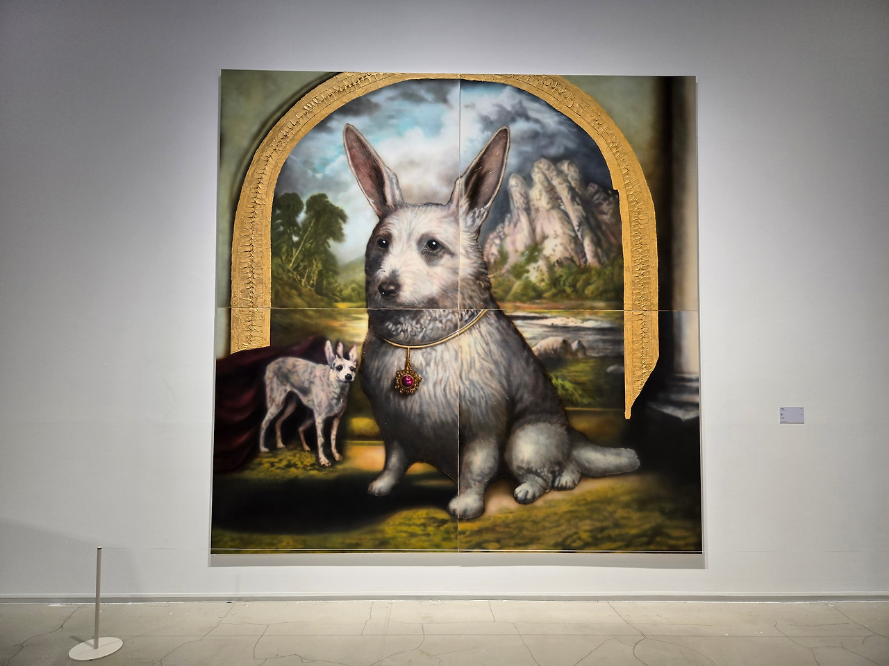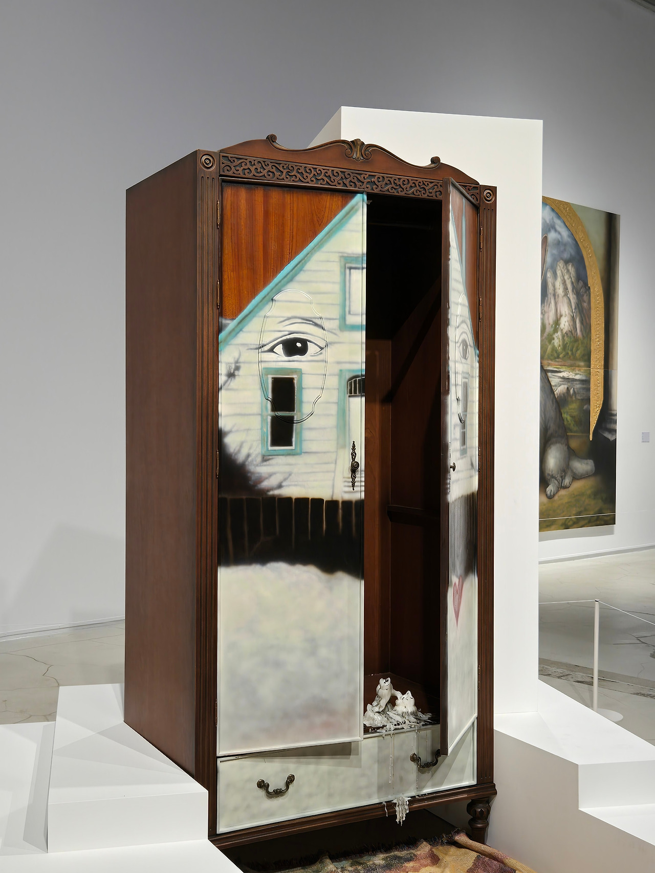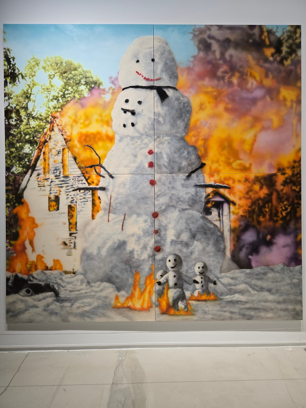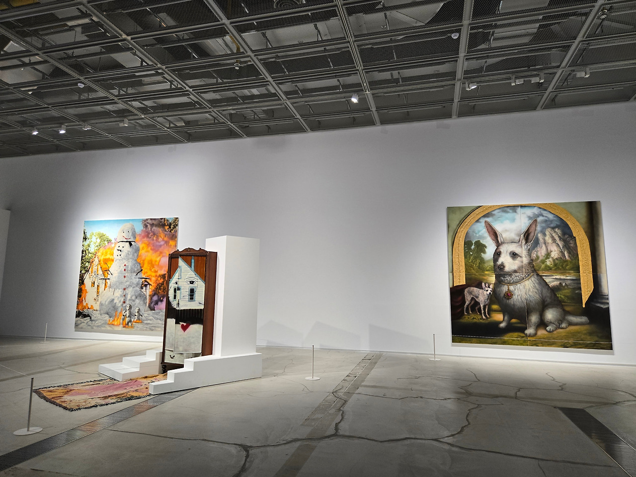 노상호 작가의 <홀리> 작품은 2022년부터 이어져 온 연작인데 동시대 미디어 환경을 크게 변화시킨 생성형 인공지능을 작업에 도입한 결과물이라고 한다. 작가는 이 작품을 통해서 인공지능을 통해 '사실적으로' 보이게끔 생성된 이미지들의 불완전하고 비논리적인 모습에 주목하였다. 한 작품엔 불타는 집 앞에 세워진 커다란 눈사람이 그려져 있었고, 또 하나에는 개의 얼굴을 한 토끼의 모습 등이 그려져 있었고, 작품들 앞에는 빈티지 옷장의 모습이 불완전한 모습의 설치물이 놓여져 있다. 이 설치물은 그림을 그린 후 다양한 요소를 결합하여 공간의 한 가운데 마치 종교적 제단과 같은 모습으로 놓여져 있다. 설명에 따르면 반듯하지 않고 비스듬히 세워진 모습은 온라인 게임 속 글리칭(Glitching) 현상, 즉 기술 오류로 인해 장면 속 요소가 기이하게 뒤엉킨 상황을 재연한 결과물이라고 한다.
