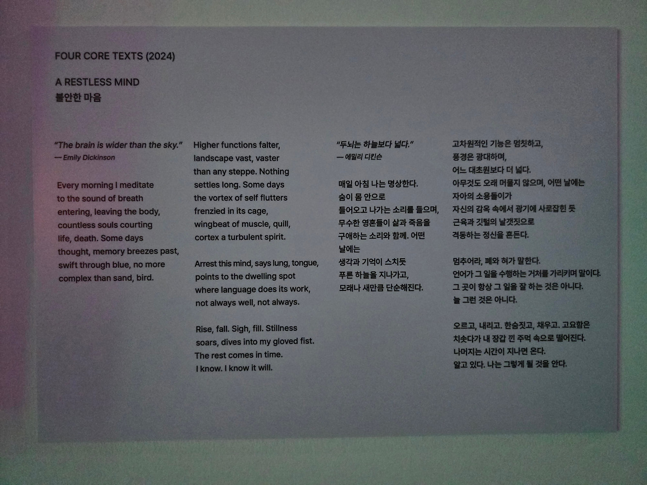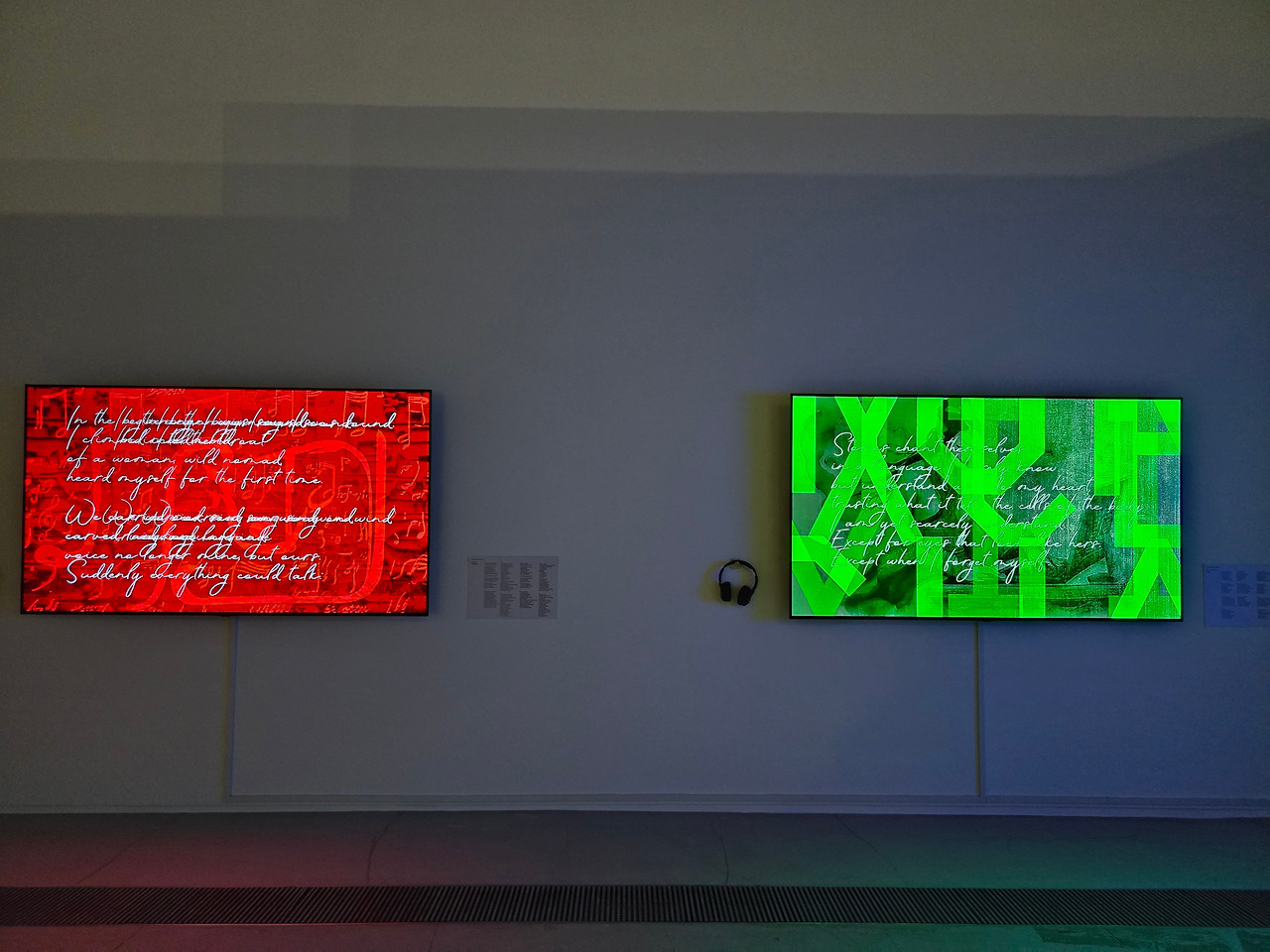 사전 지식 없이 난해하긴 다음 작품들도 마찬가지였다. 독립된 방의 어두운 조명 아래, 색색깔의 화면에서 계속해서 문자를 출력하고 있는 이 화면들도 유사한 의도로 만들어진 작품이라고 했다. 나중에 찾아보니 작가는 개인화된 맞춤형 대규모 언어 모델(LLM)로 탄생한 자신의 분신인 테크넬레지(Technelegy)와의 협업으로 시(詩)를 쓰며, 텍스트뿐만 아니라 인간 언어와 컴퓨터 코드의 합성물을 시각적으로 보여준다는 설명이었다. 관람자는 작품 옆에 비치된 헤드폰을 쓰도록 되어 있는데, 헤드폰 속에는 때로는 영어, 때로는 낯선 언어로 시를 낭독하는 소리가 들려온다. 설명을 읽어도 자세한 테크니컬한 과정은 알 수 없었지만 결과물은 무척 아름다웠고 신비로운 결과물이었다.