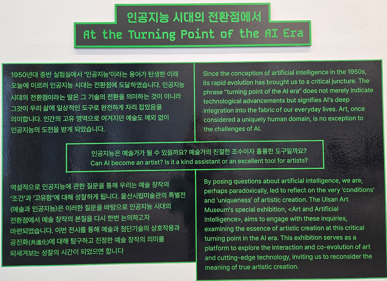 역설적으로 인공지능에 관한 질문을 통해 우리는 예술 창작의 '조건'과 '고유함'에 대해 성찰하게 됩니다. 울산시립미술관의 특별전 <<예술과 인공지능>>은 이러한 질문을 바탕으로 인공지능 시대에 전환점에서 예술 창작의 본질을 다시 한번 논의하고자 마련되었습니다. 이번 전시를 통해 예술과 첨단기술의 상호작용과 공진화(共進化)에 대해 탐구하고 진정한 예술 창작의 의미를 되새겨보는 성찰의 시간이 되었으면 합니다.