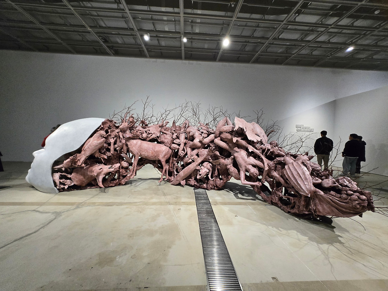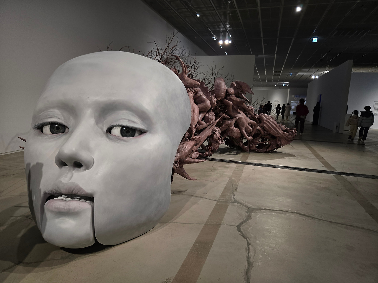 Section 2에서 가장 인상 깊었던 작품은 노진아 작가의 <진화하는 키메라-가이아>라는 작품이었고 이 앞에 관람객이 가장 많이 모여있었다. 작품의 전면은 사람의 얼굴 같은 마네킹이었는데 눈동자가 이리저리 움직이는 모습이라 마치 살아있는 듯한 느낌이 들었다. 그런데 그 얼굴 뒤 쪽으로는 연보라색의 조형물이 길게 늘어서 있는데 자세히 보면 마치 유물과 유해와도 같이 공룡과 동물, 인간의 모습들이 뒤엉켜 있어서 기괴한 형상을 연출하고 있었다.
