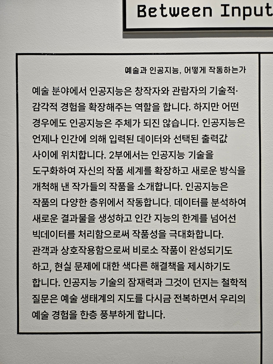 설명문에 나와 있듯이 인공지능은 확실히 창작자와 관람자의 기술적 감각적 경험을 확장해주는 역할을 하지만, 인공지능이 주체가 되지는 않는다. 하지만 인공 지능을 매개로 입력과 출력의 사이에 변수가 도출되는 상황이 연출된다.