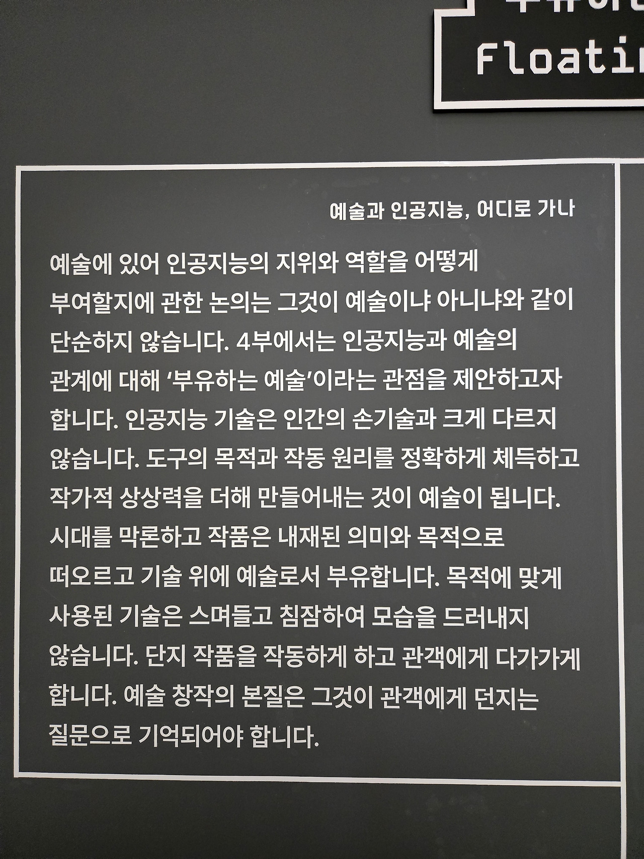 이번 전시는 '부유하는 예술'이라는 관점을 통해 기술과 예술이 어떻게 끊임없이 변화하며 함께 진화할 수 있는지를 보여줍니다. 기술은 결코 예술의 주체가 될 수는 없지만, 그것이 예술 창작의 무한한 가능성을 열어준다는 사실을 확인할 수 있었습니다. 예술은 질문을 던지는 행위이며, 기술은 그 질문을 더욱 확장하고 깊이 있게 만드는 도구일 뿐입니다.